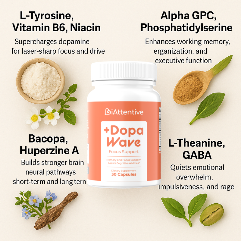 DopaWave supports multiple brain pathways involved in emotional control. The ingredients help stabilize dopamine fluctuations that cause those frustrating emotional rollercoasters and overwhelming anxiety that make ADHD so exhausting. Our customers report fewer explosive reactions, reduced overthinking spirals, and a newfound ability to let small things go. Many describe it as "finally having a pause button" between feeling and reacting - all while maintaining their natural emotional depth and personality.
